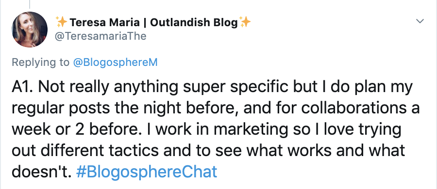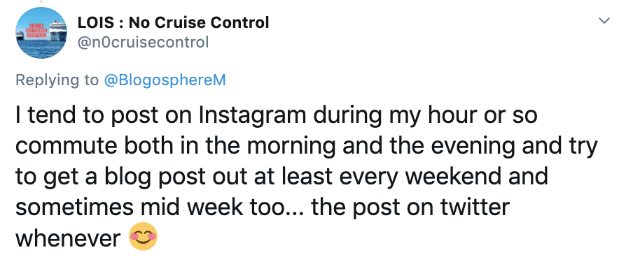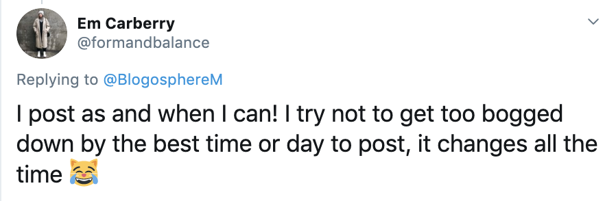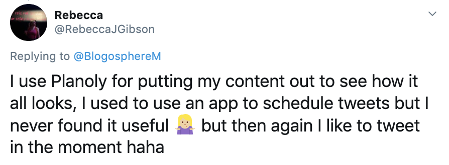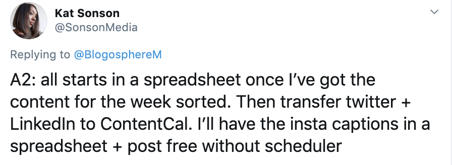 There was a mixed response to this question with some preferring to post in the moment and others using scheduling apps like Buffer and Hootsuite. Planoly was also mentioned by a few creators to help organise their content.