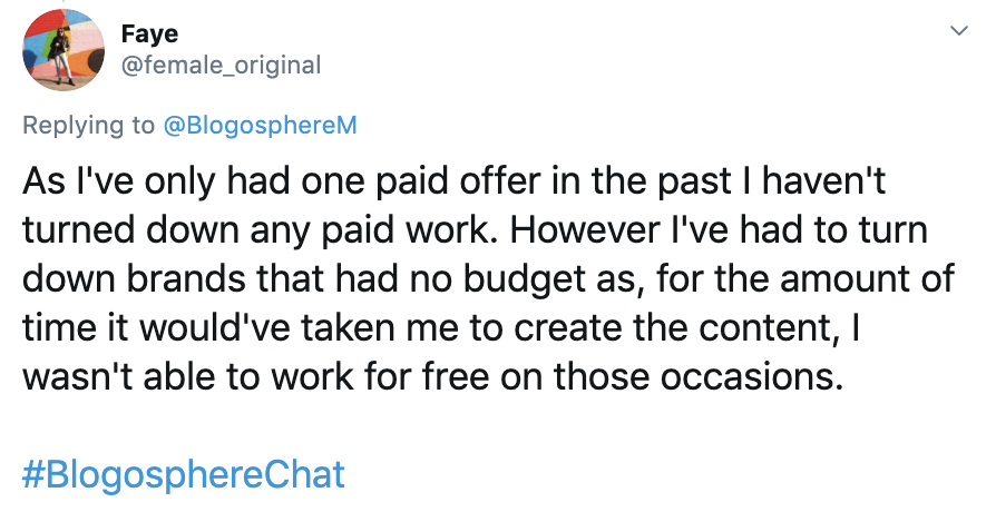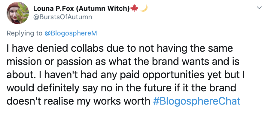 Many admitted to turning down brand collaborations, mainly due to them not offering to pay bloggers, or because the campaign did not align with their content. There was a lot of discussion surrounding feeling bad about turning down these opportunities, but an overall agreement that knowing your worth was more important.