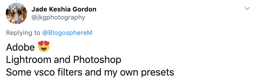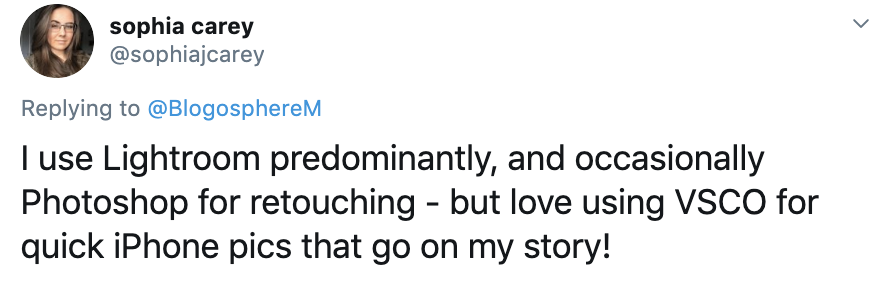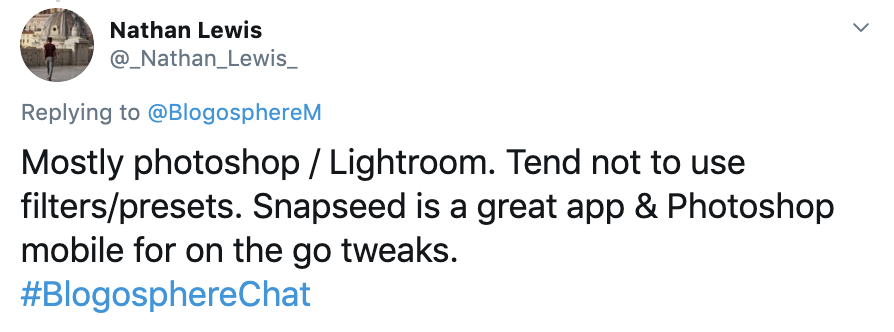 Adobe’s Lightroom and Photoshop appeared to be popular options for bloggers and influencers who participated in the chat, as well as mobile apps like VSCO and Snapseed. Interestingly, most preferred to keep their edits quite minimal without the need for lots of filters.